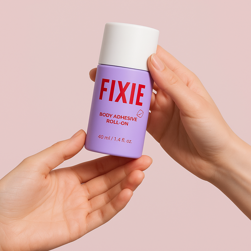 Stay secure, feel free. Fixie is a skin-safe, water-based body adhesive that holds your clothes in place—no slips, no discomfort, just all-day confidence.